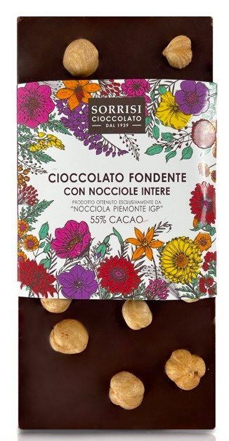 Dark chocolate born from a precious blend that gives a full and intense cocoa taste, characterized by a balanced flavor between fruity and bitter notes and decorated by hand with crunchy Piedmont hazelnuts.