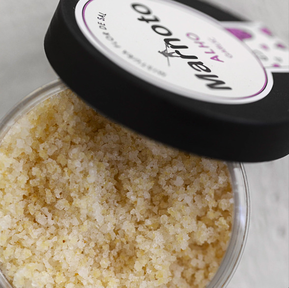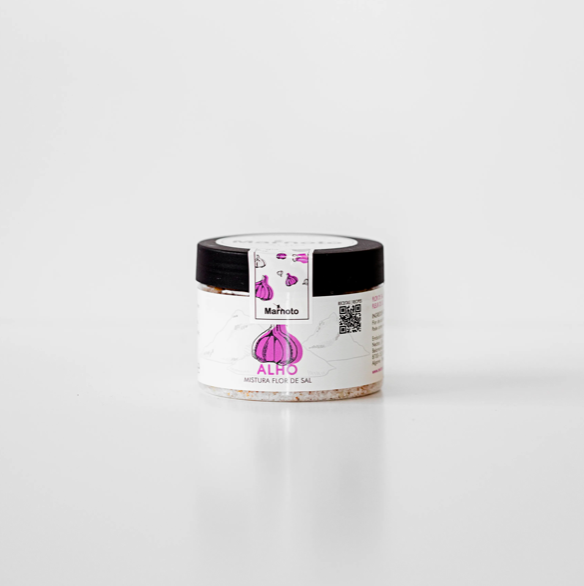 Portuguese sea salt with garlic Finest hand-scooped Flor de Sal from the Belamandil salt pans in Portugal with a pleasant touch of garlic.